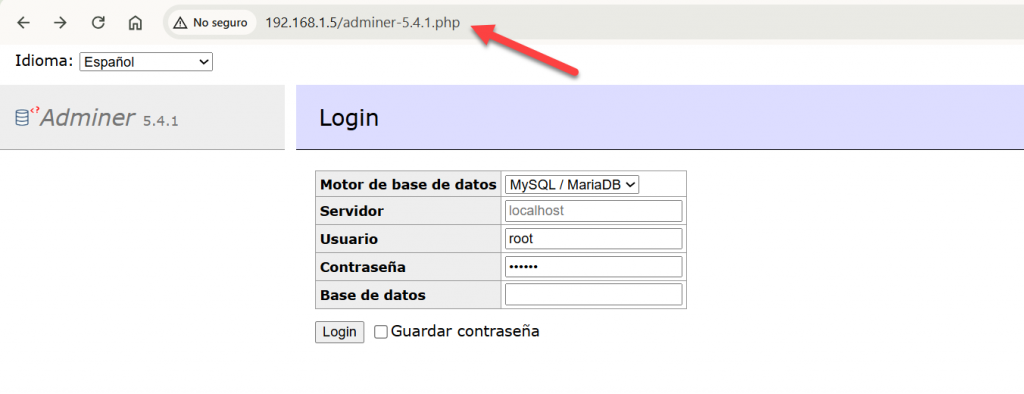 Para ejecutar la aplicación entonces bastaría con colocar la URL: http://localhost/adminer-5.4.1.php