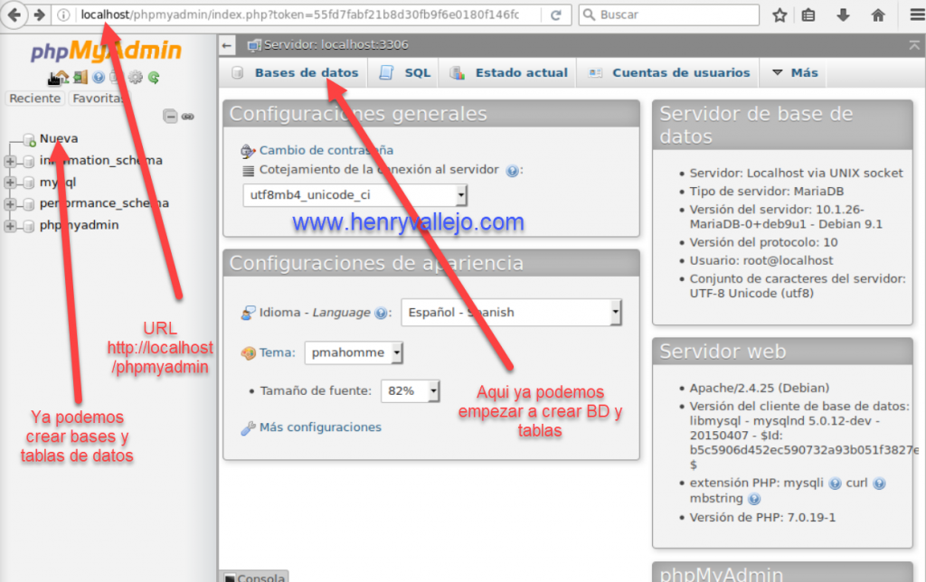 El proceso continua normalmente; aquí se supone que podemos acceder a a la pagina de gestión de las bases de datos tan solo colocando la siguiente dirección en el navegador: