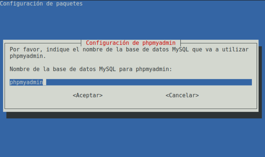 La base de datos por defecto y de configuraciones que crea phpMyAdmin tiene su mismo nombre la dejamos tal cual.
