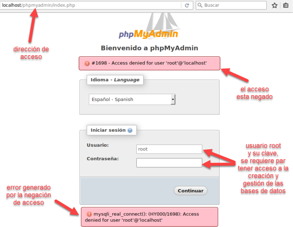 Ahora debemos solucionar el problema de ingreso al phpmyadmin, ya que debemos hacerlo como root para poder tener los privilegios de creación, eliminación, ingreso, etc de las bases de datos en MariaDB o MySQL.